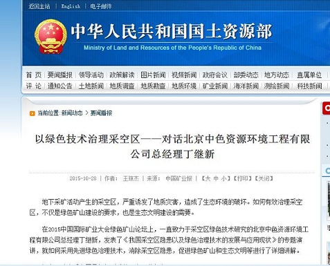在2015中国国际矿业大会绿色矿山论坛上,公司总经理丁继新发表了《我国采空区隐患以及绿色治理技术的发展与应用现状》的专题演讲,就如何采用先进绿色治理技术,消除采空区隐患,促进绿色矿山和生态文明等进行了详细讲解。该演讲由中国矿业报和国土资源部网站报道。